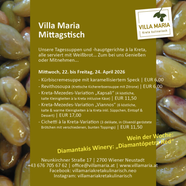 Alle unsere Mittagsgerichte gibt es zwischen 12.00 und 14.30 Uhr (so lange der Vorrat reicht) zum bei uns Genießen im Villa Maria – Genussladen, Mezedes & Wein-Bar, A 2700 Wiener Neustadt, Neunkirchner Straße 17 (T: 0676 – 705 67 62) oder auch zum Mitnehmen.